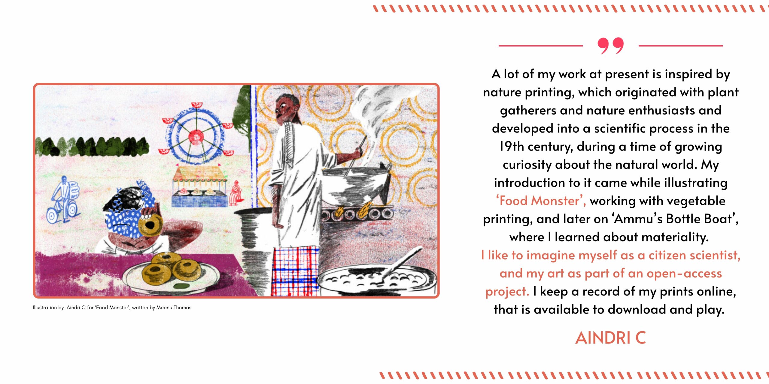 Canato Jimo, award-winning illustrator and Art Director at Pratham Books, says: “Whenever we meet children, they’re always excited about illustrations and they ask, ‘How do you make them?’ We wanted a child to be able to look at this book and say: ‘Oh, this is how my favourite illustrators created the books that I love!’”